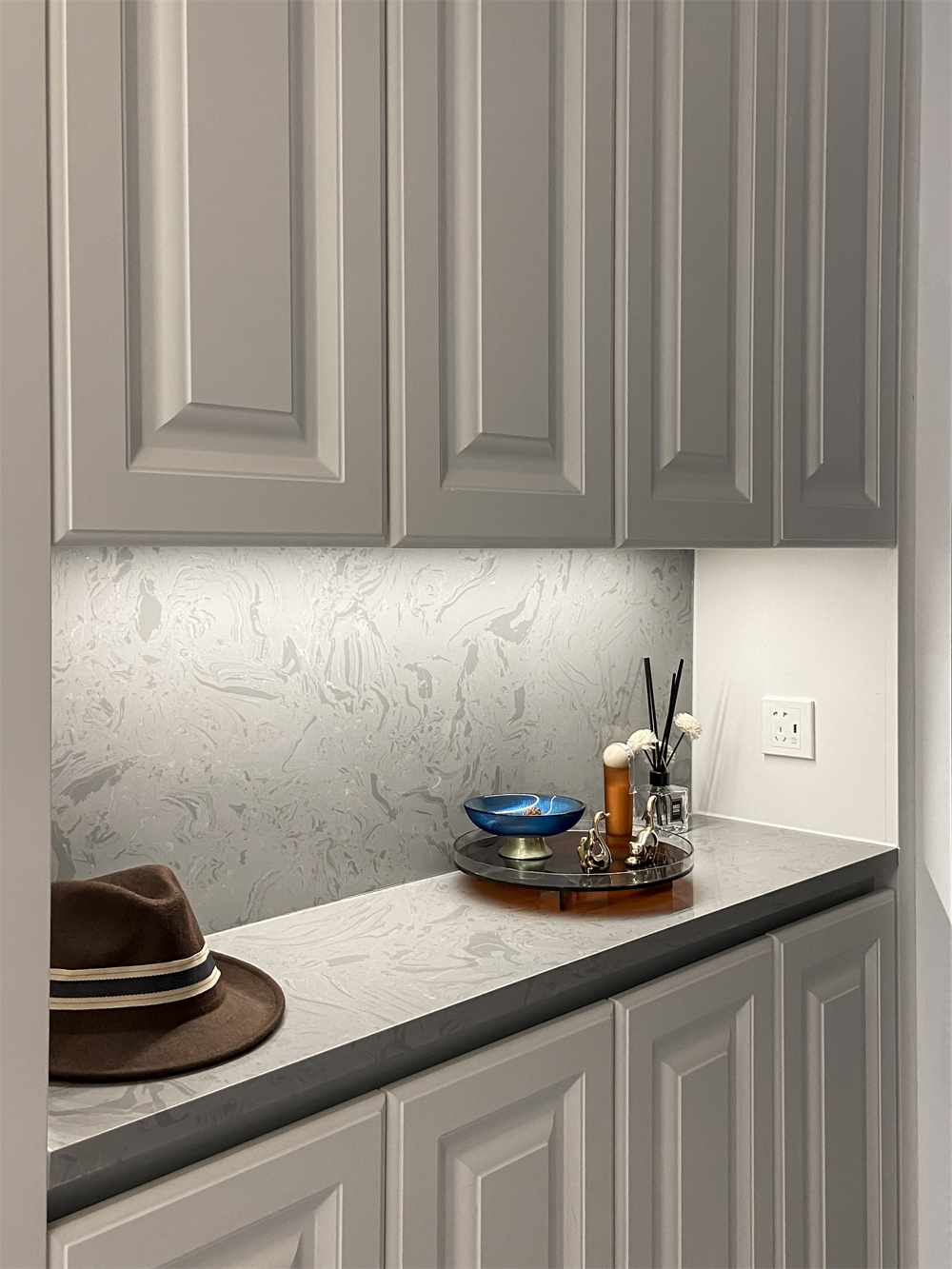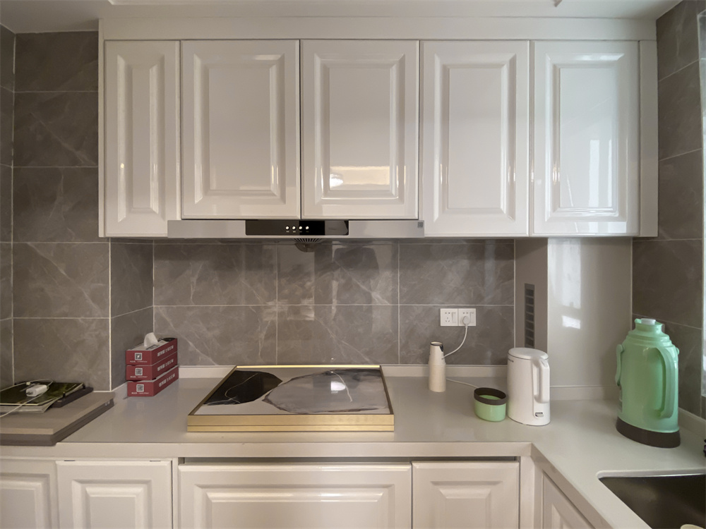 廚房是L型的櫥柜布局,切菜區(qū)、臺盆區(qū)、烹飪區(qū)形成一條動線,讓烹飪不再手忙腳亂。芬蘭白膜壓櫥柜門板,如奶油般的質(zhì)感更加細膩自然。吊柜應當與臺面保持距離,避免因為距離過近影響使用效果。