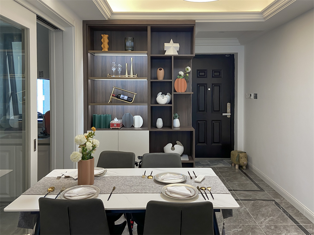 整排的餐邊柜收納柜,讓功能性大大加強,平常的餐具、藏酒都可以妥妥的安排下,開放的柜子作為展示,也可以放置一些常看的書和裝飾擺件。餐桌上擺放花束讓吃飯多了一絲溫馨,餐邊柜的不規(guī)則設(shè)計柜層,不僅滿足不同高度物品收納的需要,使整體更加具有層次感。