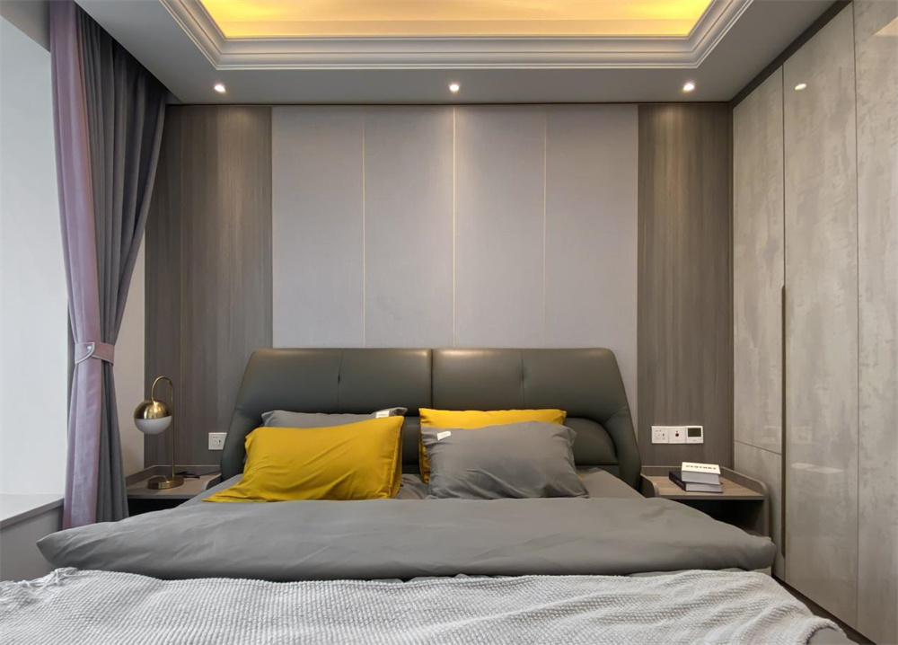 主臥整體延續(xù)輕奢的風格,以黑白灰襯底。背景板用的是灰白兩色護墻板,呈現(xiàn)簡約干練的特質(zhì)。墻面未著任何的點綴,卻也不顯得空曠突兀。以灰色為主調(diào)的舒適床品,加以穿插其間的黃色調(diào),在床頭射燈的氛圍烘托下,時尚又不失溫馨感。