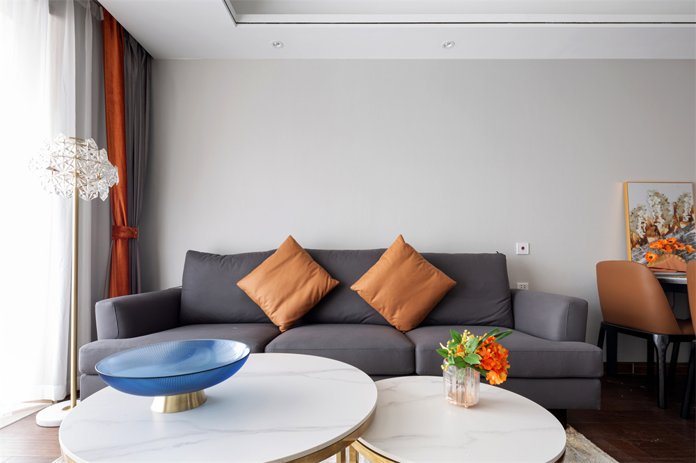 布藝灰色沙發(fā)布料十分柔軟,坐下去沙發(fā)表面也具有一定彈性。橘色的抱枕仿佛將整個(gè)空間點(diǎn)亮了一般,與右側(cè)的橘色座椅顏色相呼應(yīng)。圓形拼接的茶幾在寓意上傳遞出“和諧”,搭配金色的桌腳一下子提升了高級(jí)感。