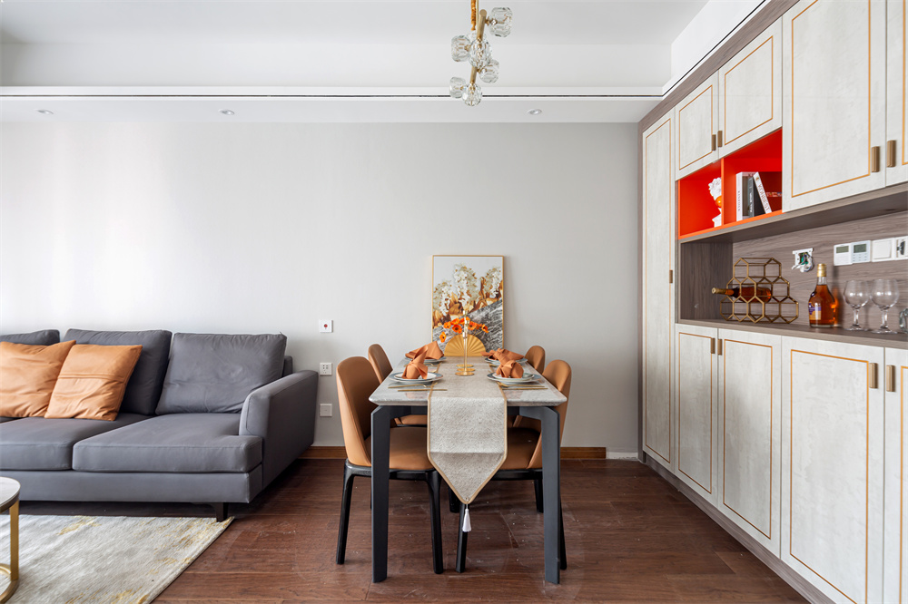 餐廳處的風(fēng)格秉承了輕奢風(fēng)格的特點(diǎn),設(shè)計(jì)師采用橘色、金色、芬藍(lán)構(gòu)成了餐廳的主色調(diào)。正面到頂?shù)牟瓦吂衽c墻面無縫銜接,通過餐邊柜上的擺件便可看出屋主的品味。裝飾物的點(diǎn)綴讓餐邊柜獨(dú)具魅力,金屬酒瓶的架子,對(duì)于日常喜歡小酌一口的家庭來說十分合適,如果再安裝酒柜的話空間不夠,餐邊柜的功能相比酒柜更加實(shí)用。