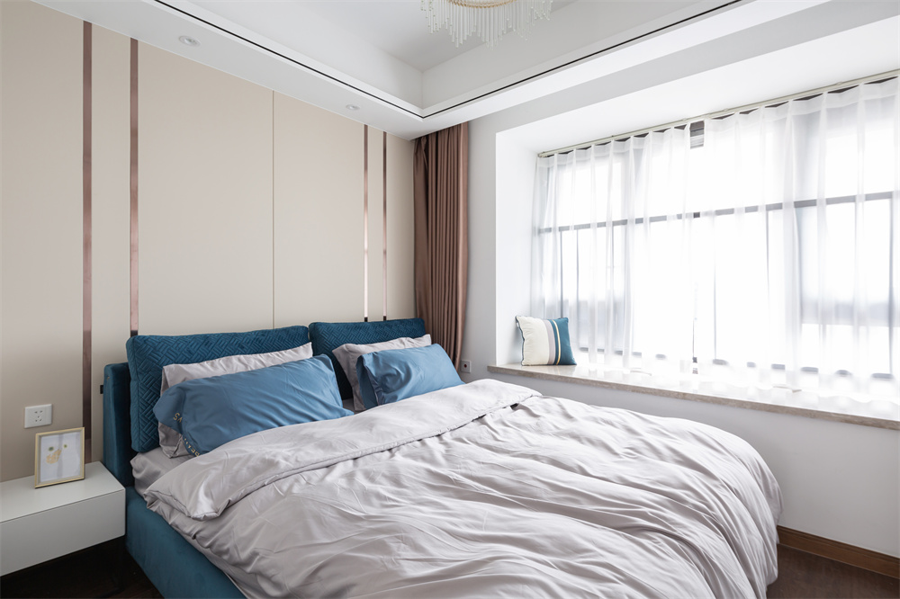主臥室在沿用輕奢的風(fēng)格同時(shí)做了細(xì)微的調(diào)整,薄荷綠色的背景顯得清新又自然,仿佛如修剪草地后散發(fā)的清香。衣柜延伸出的轉(zhuǎn)角區(qū)域充分利用了衣柜旁的空間,可以隨手放置書本、眼鏡、收納籃。