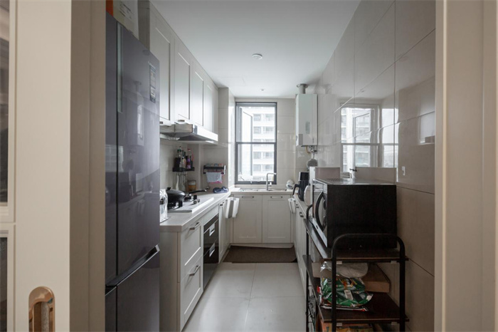 左側(cè)便是與玄關(guān)柜相連的餐邊柜,餐邊柜集酒柜、收納柜的功能于一體,最大限度發(fā)揮出產(chǎn)品的使用價(jià)值。芬蘭白的門(mén)板顏色與透亮的玻璃相搭配,不需要額外給物品增加神秘感,想要的東西拉開(kāi)柜門(mén)便可以拿到。餐邊柜中間部分上方的圍欄設(shè)計(jì),放置石膏雕像增加空間內(nèi)的藝術(shù)感。廚房:廚房處一眼望去整體空間內(nèi)物品、柜體很齊全,但是顯得略微有些擁擠,容納一到兩個(gè)人在廚房里忙活已是足夠 。