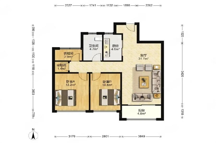 這套兩居室的戶型簡單來說便是凸字型的房屋空間結(jié)構(gòu),戶主想要增加客廳的面積,將陽臺打通,于是客廳處總共面積為35.9㎡,在主臥處的儲物間和衣帽間也將兩者打通,主臥的面積為16.5㎡,滿足了日?;镜纳钚枨蟆?/span>