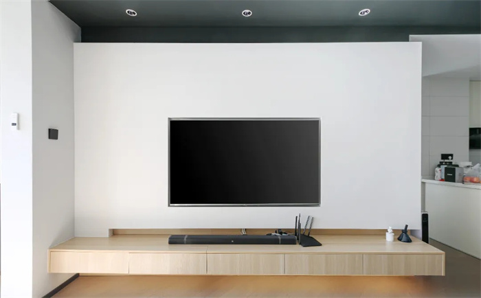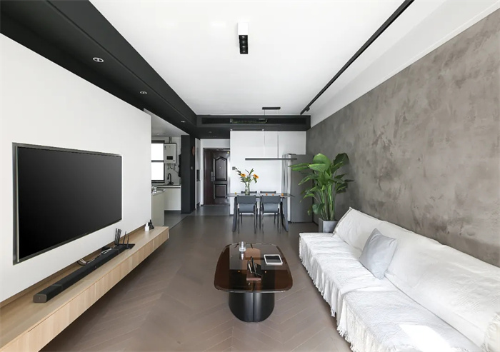 電視背景墻沒有做整面的內(nèi)嵌式的電視柜,考慮到客廳內(nèi)的整體面積和空間展示,以整面的大白墻打底更符合極簡主義的特點(diǎn),在電視柜的內(nèi)部安裝了燈帶,夜晚看電視的時候也能多一份溫馨。