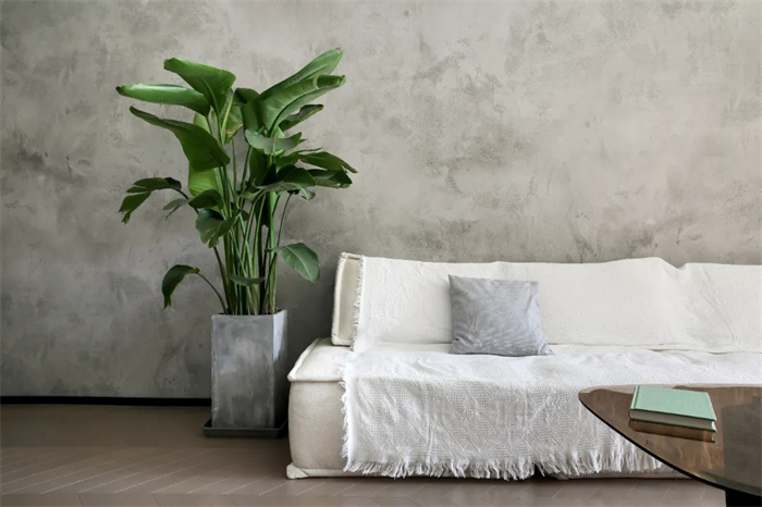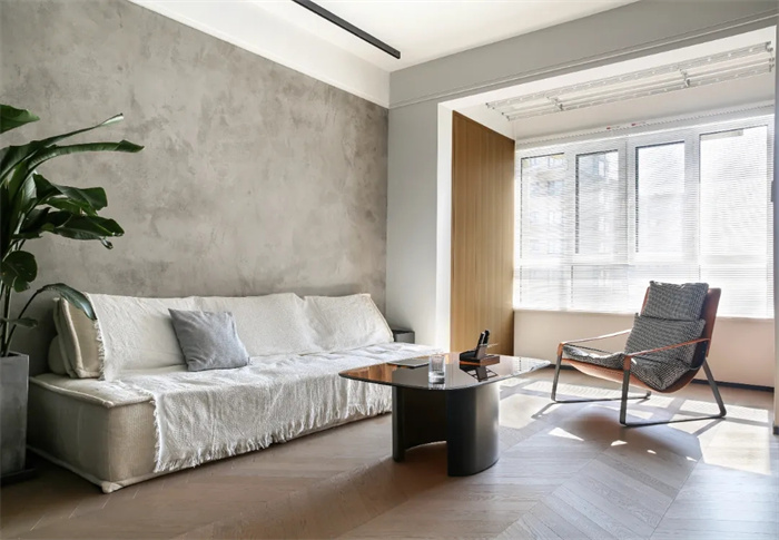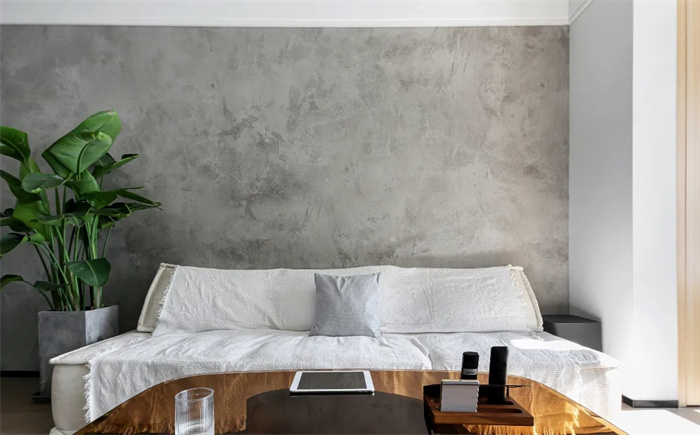 類似于侘寂風(fēng)的水泥風(fēng)格背景墻,斑駁的灰色紋路給人穩(wěn)定情緒的作用,背景墻采用的是仿真水泥墻面的墻布,比較實(shí)用且可以降低裝修成本,觸感柔軟。沙發(fā)上蓋了一條白色流蘇沙發(fā)布,以卡其色沙發(fā)套打底,整體顯得十分柔和。魚骨紋的拼接地板承襲了空間一貫的簡約風(fēng)格,偌大的立體綠植給增添一抹生機(jī)。