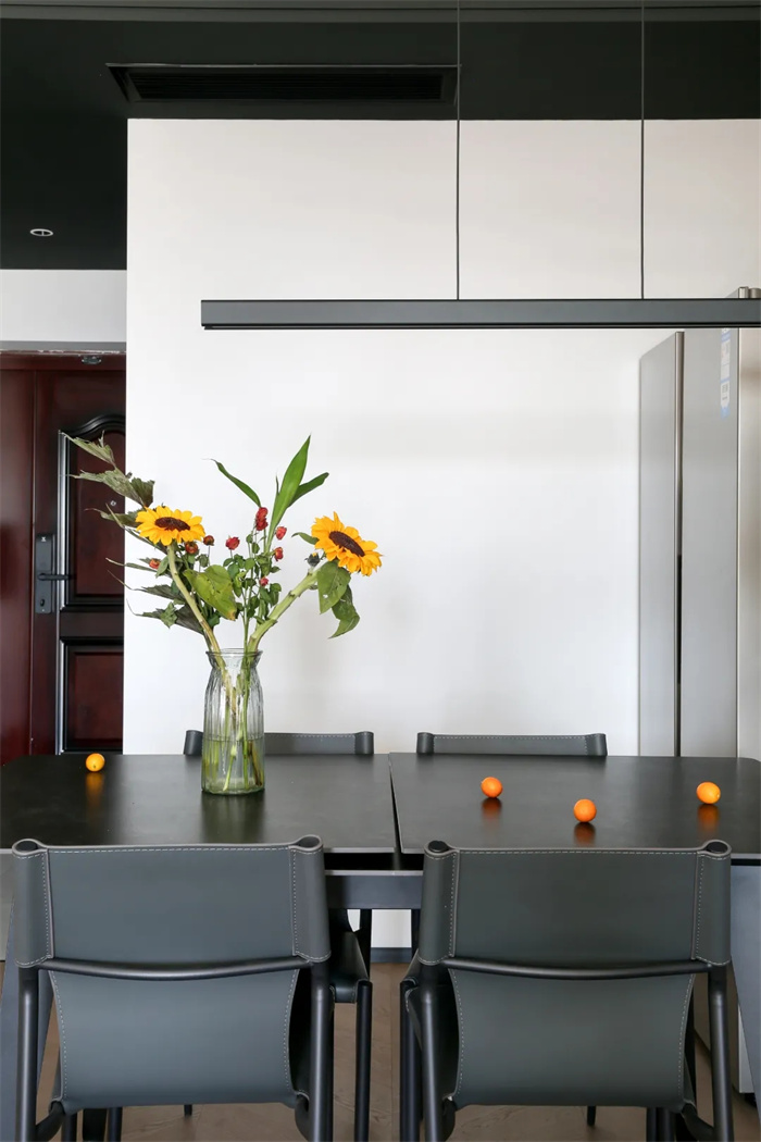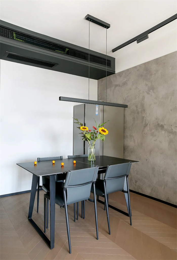 水泥灰的餐桌透露出滿滿的工業(yè)風(fēng)設(shè)計,桌上擺放新鮮的花束,業(yè)主時不時會購買新鮮的花束擺放在餐桌上,展現(xiàn)出對美好生活的精準(zhǔn)向往。
