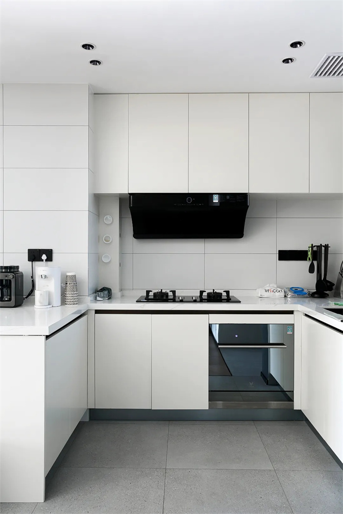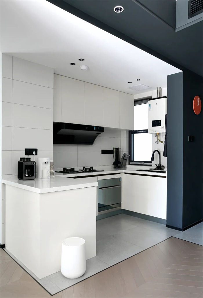 廚房在進(jìn)門的右側(cè)打造出了U字型的空間布局,類似于公寓性質(zhì)的開放性廚房,在玄關(guān)延伸出一部分墻體,在廚房格局的左側(cè)延伸一部分可以作為島臺使用,形成完整的廚房空間。