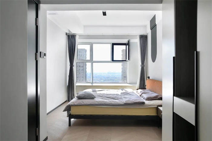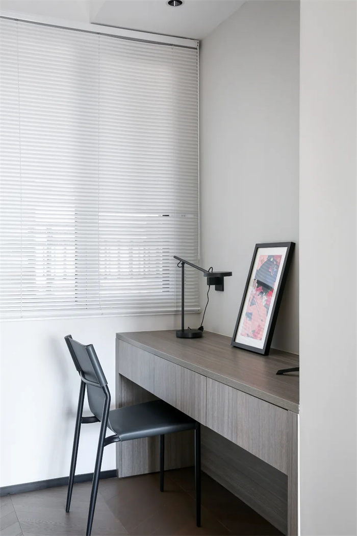 次臥同樣是采用整面到頂?shù)囊鹿?,搭配黑色的長條把手,靠墻的一側(cè)打造成開放收納格的設(shè)計,延伸的桌面下方放了暖風(fēng)機(jī)等設(shè)備,次臥格局雖不大,勝在簡約。