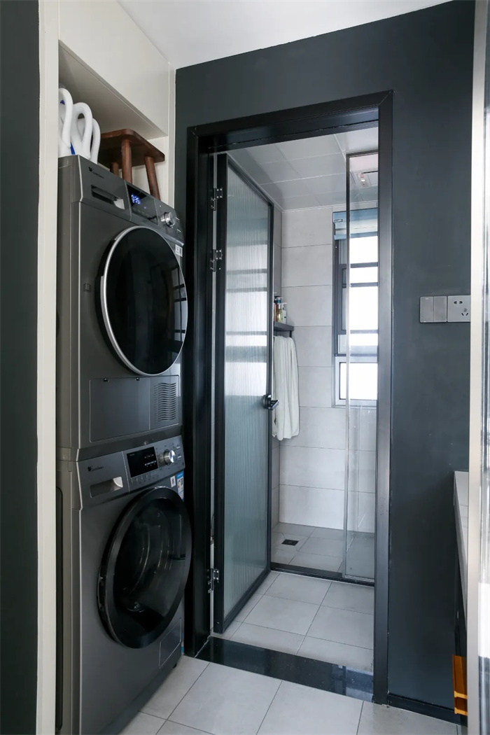 由于在陽臺處安裝了柜體,并且留出一塊區(qū)域作為狗狗的休息區(qū),因此衣物洗滌和烘干的區(qū)域移到了衛(wèi)浴間。如果陽臺沒有晾曬衣物的需要,日常使用烘干機(jī)可以作為替代。