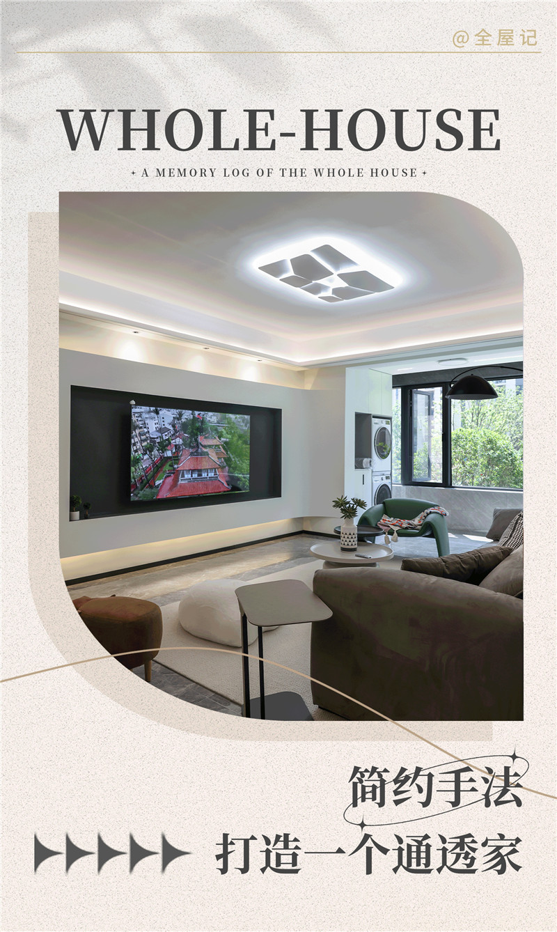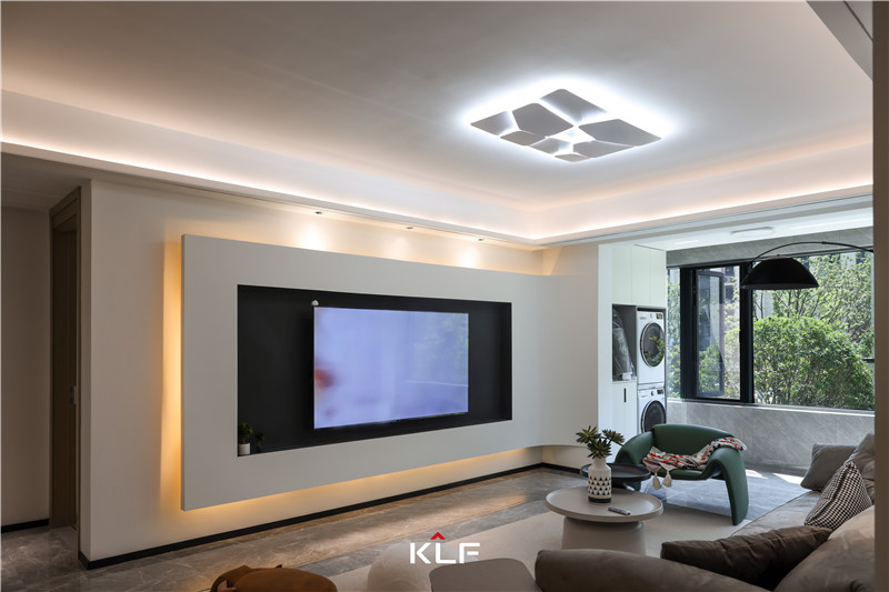 在客廳背景墻的設(shè)計中,客來福選擇弧形造型處理,因為家中收納空間充足,索性不做柜體,讓電視背景墻呈現(xiàn)一種“懸浮”效果,更具有輕盈感。