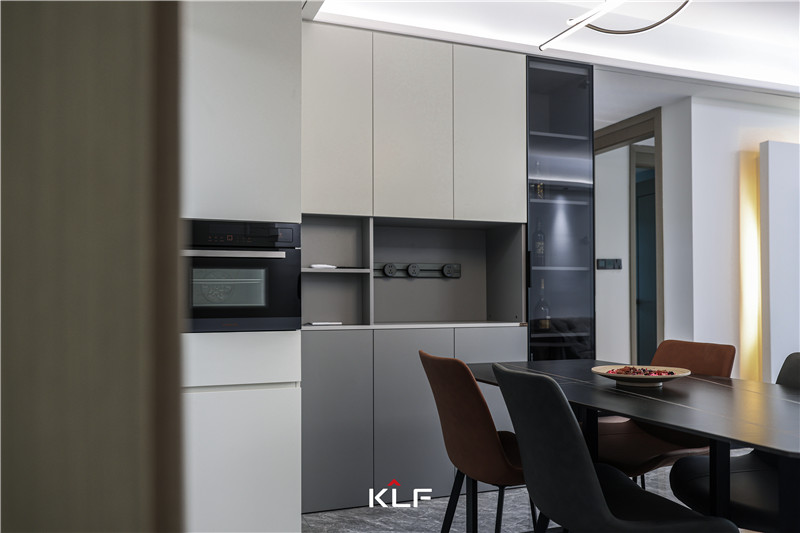 餐邊柜采用二八原則,上下吊柜做撞色處理,免把手設(shè)計讓柜面更簡潔。留出專門的空間做酒柜收納,搭配黑玻柜門彰顯格調(diào),通體拉手實用美觀。