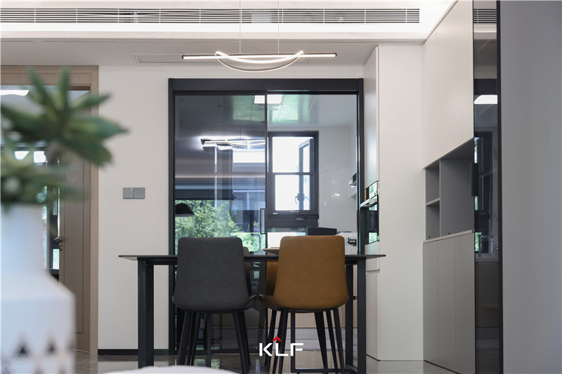 廚房與餐廳相連,以吊軌移門進行空間區(qū)分,坐在餐桌前就能望到廚房外的一抹綠意,令人心曠神怡。