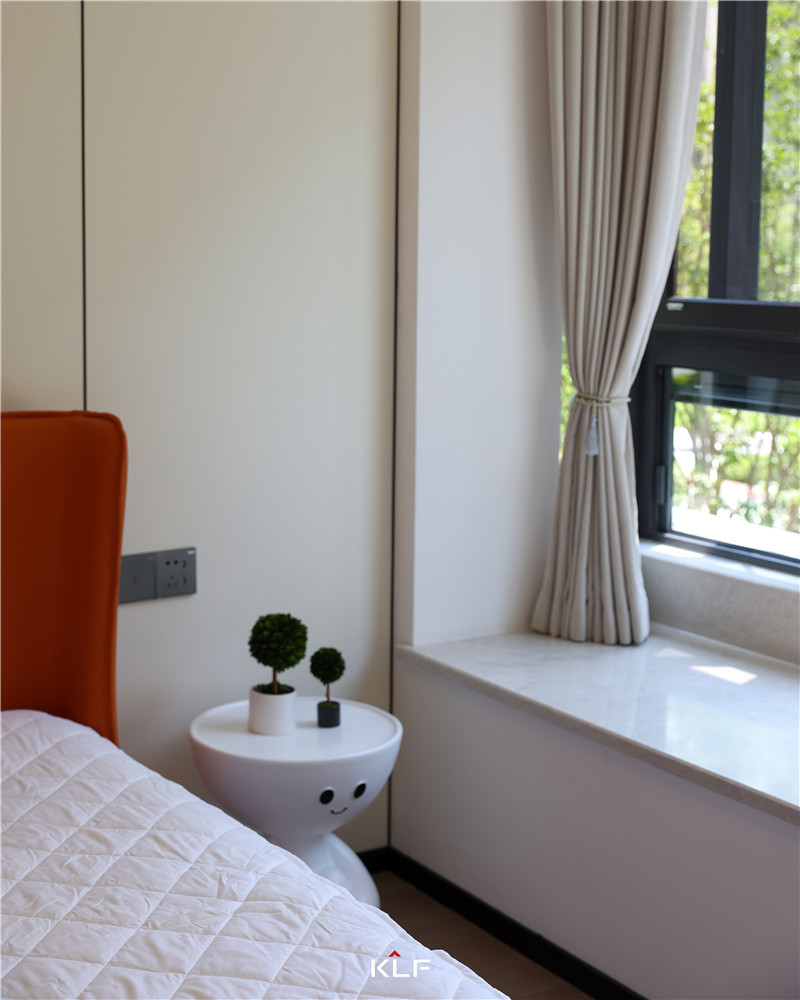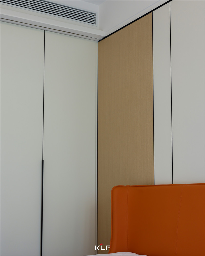 臥室設(shè)計的巧思更在于背景墻的拼接設(shè)計,純白難免單調(diào),那就組合原木色吧!簡雅的白色碰撞溫潤的木色,營造出溫暖又自然的人居感,更呼應(yīng)屋主想要的“通透自然”。