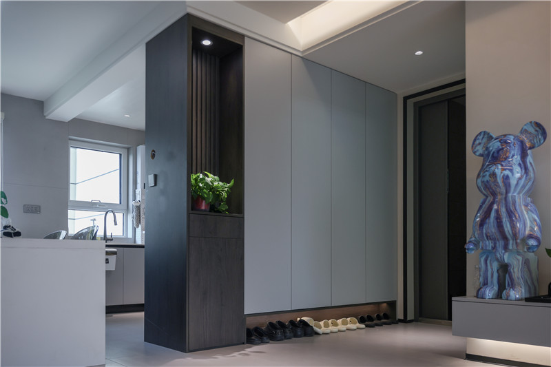 陽(yáng)臺(tái)一側(cè)選用展示格+到頂收納柜進(jìn)行儲(chǔ)物與展覽,另一側(cè)根據(jù)家電做洗衣柜,空間理想化利用,讓家有更多自由空間但依然有序。