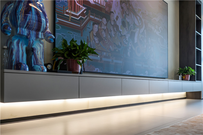 從玄關(guān)踏入后,極簡(jiǎn)風(fēng)的設(shè)計(jì)感便油然而生。通頂?shù)男癫捎妹饫衷O(shè)計(jì),檀木紋的造景臺(tái)下方做收納,上方采用格柵造型,簡(jiǎn)約中呈現(xiàn)敦厚質(zhì)感。柜體不落地設(shè)計(jì)加設(shè)燈帶輔助照明,更加實(shí)用。