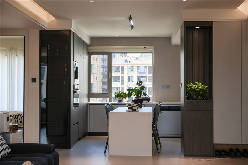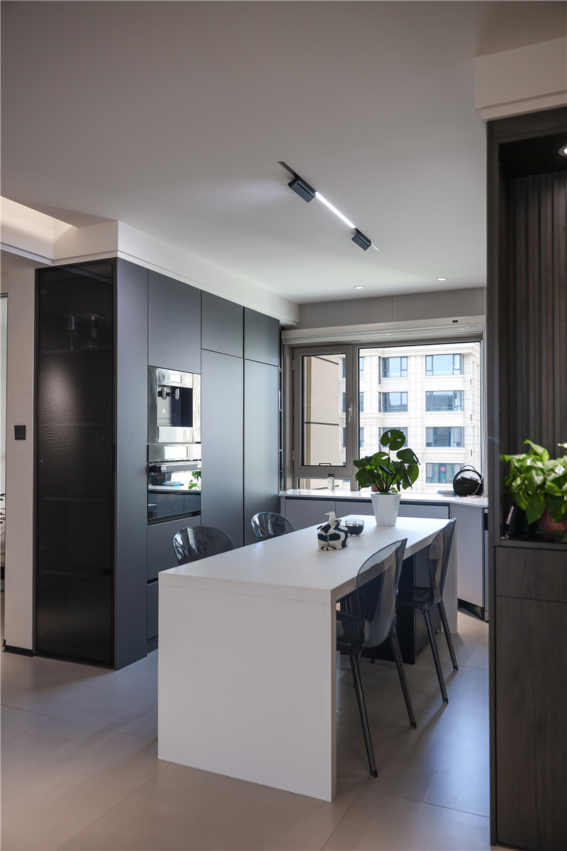 餐廳以白色系餐桌搭配透明餐椅,增添空間時(shí)尚感;靠墻一側(cè)做餐邊柜,檀木紋搭配水洗灰,撲面而來(lái)的意式極簡(jiǎn)風(fēng),內(nèi)嵌家電+免拉手設(shè)計(jì),給人不費(fèi)勁的精致感。