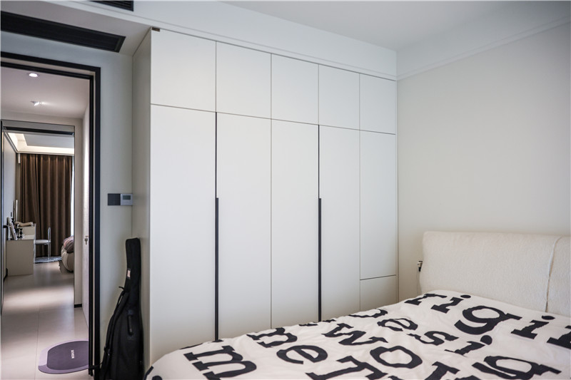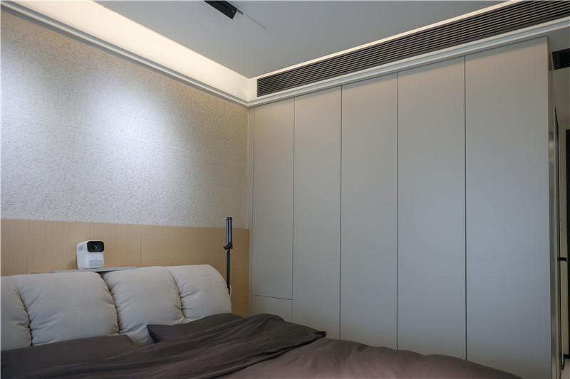 因?yàn)榧依餂](méi)有做衣帽間,所以在主臥中,客來(lái)福打造了一面到頂高柜進(jìn)行衣物儲(chǔ)納,茶白的色調(diào)清冷高級(jí),同樣也運(yùn)用在床尾的斗柜上,抽屜造型更便于拿取物品。與斗柜相連,同色系同材質(zhì)的梳妝臺(tái)也滿足了居者的生活需求。