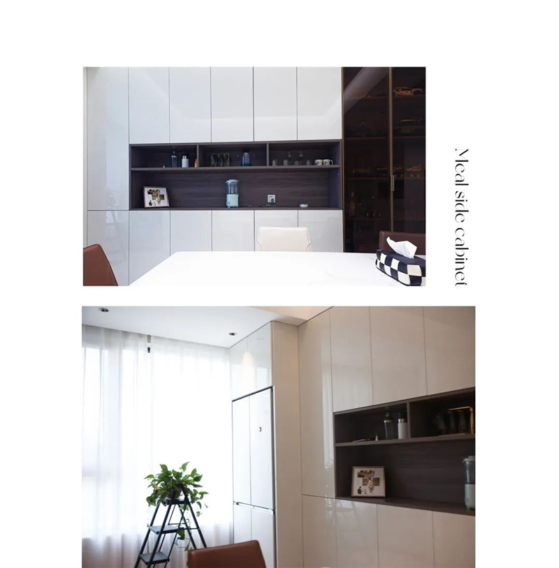 餐邊柜設(shè)計(jì)整面墻并一柜到頂,并作不同功能分區(qū);靠近陽(yáng)臺(tái)保留吊柜地柜用作收納,中部?jī)?nèi)嵌冰箱減少?gòu)N房收納壓力。
