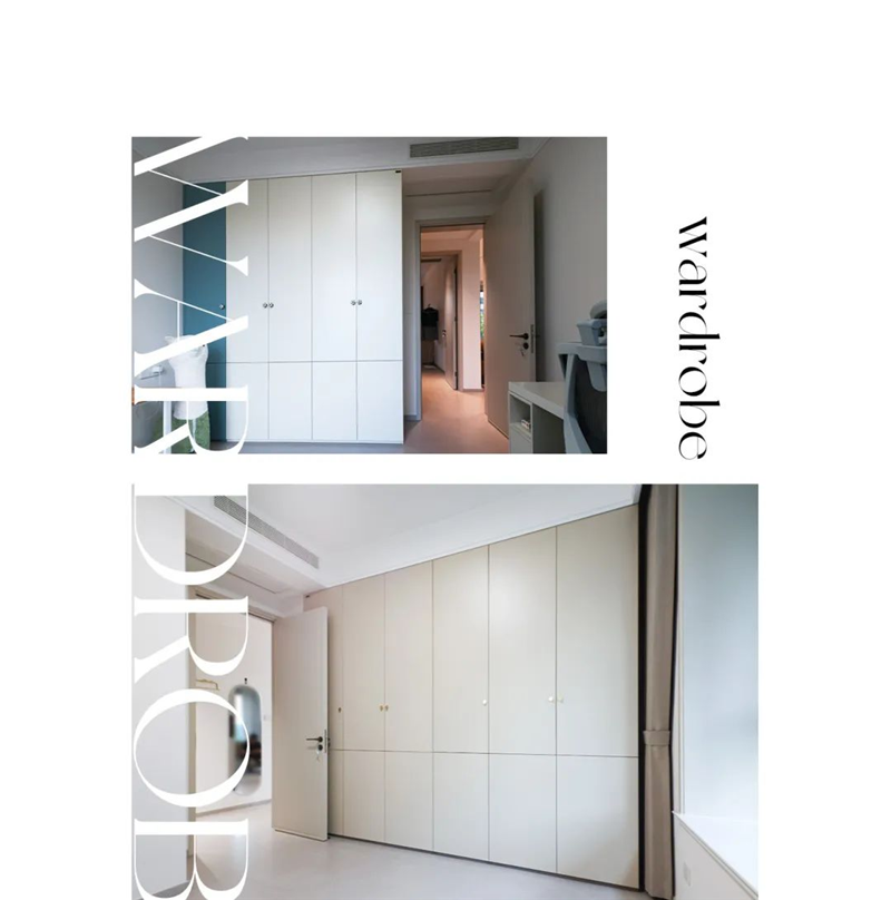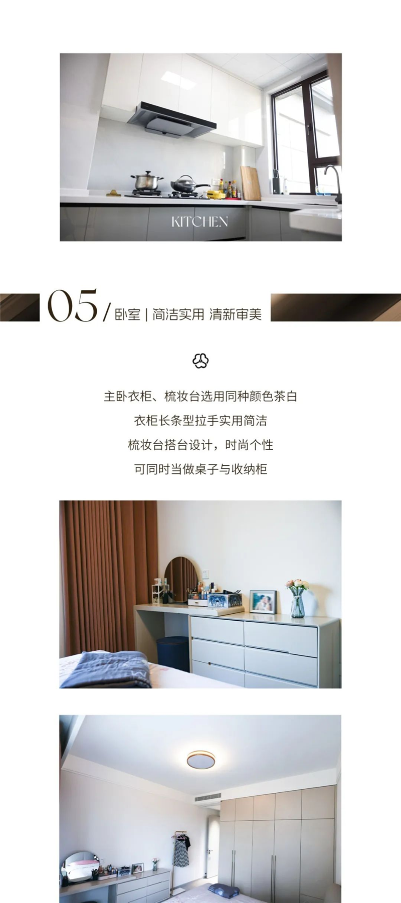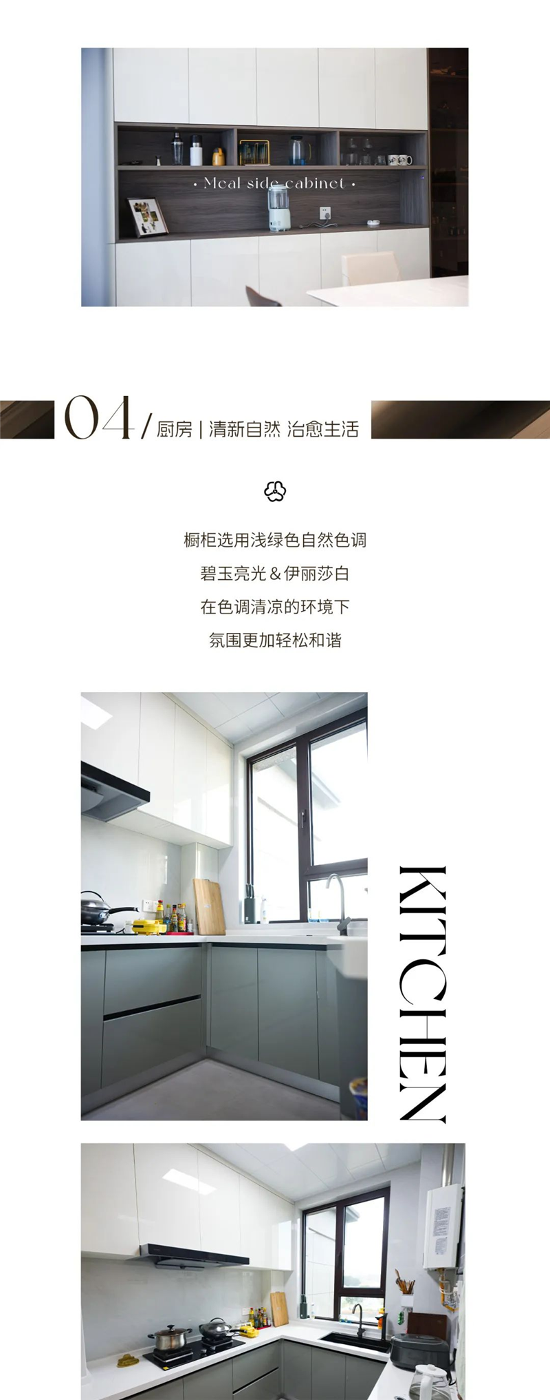 主臥與北次臥書柜都選用了茶白色作和諧統(tǒng)一,南次臥選用拼色設(shè)計(jì),芬蘭白&蔚藍(lán),簡(jiǎn)潔清新的特性與廚房的清涼色調(diào)相呼應(yīng)。