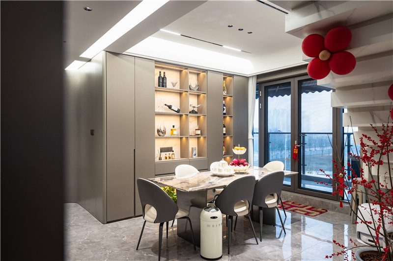 櫥柜柜體以簡約黑拉手配以無拉手設(shè)計,視覺上清爽利落;將烤箱、冰箱大電器嵌入高柜中,和諧布局;餐廚空間以推拉門做區(qū)隔,有效解決頑固污漬困擾,讓空間更加明亮干凈。