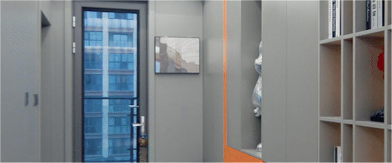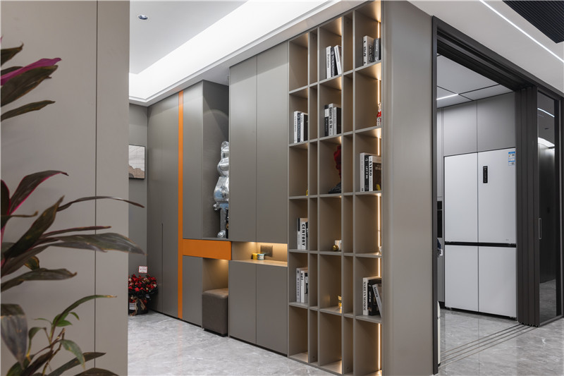 玄關(guān)柜到頂設(shè)計,充當(dāng)家里的隔斷,優(yōu)化空間動線。整體一字型構(gòu)造,以一抹橘調(diào)點色,穿插設(shè)計以設(shè)計感增強(qiáng)柜體美感。