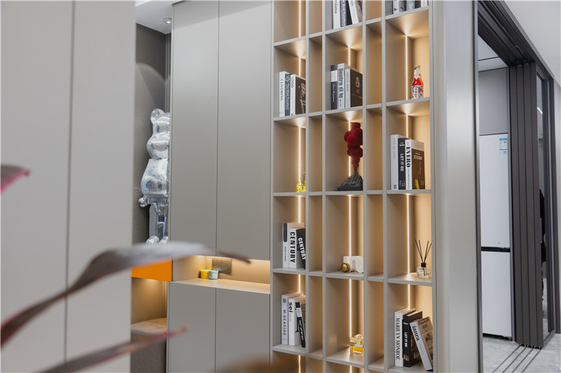 玄關(guān)柜一側(cè)做隔層,嵌入條帶燈,是裝飾區(qū)、也是閱覽區(qū)。