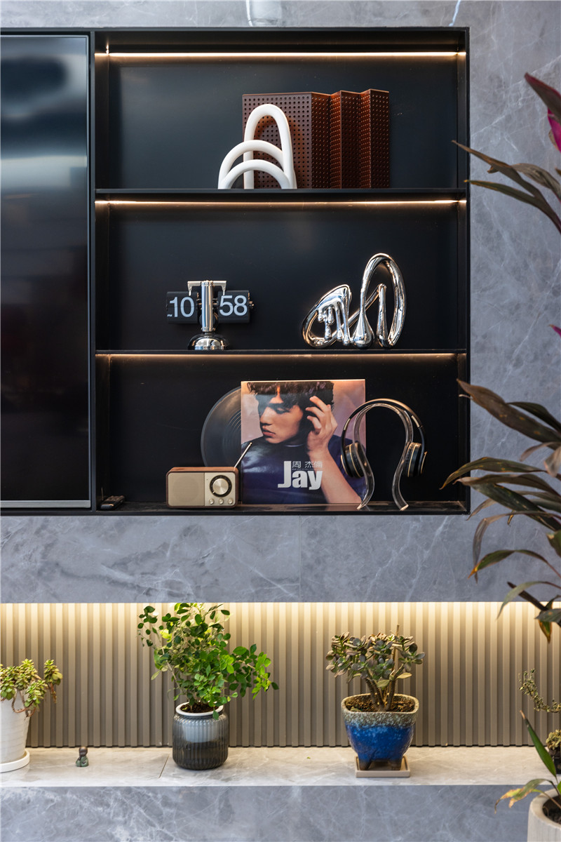 背景墻采用縱向格柵及跳色,視覺感強(qiáng);大理石板、門板拼接,其挑高設(shè)計突顯層次感;電視機(jī)旁側(cè)協(xié)調(diào)裝飾柜,深色調(diào)縱深感強(qiáng)。
