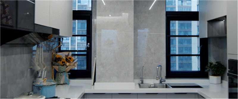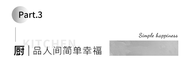 櫥柜以U型構(gòu)造合理利用空間,其灰調(diào)與白調(diào)配合,簡約好看。洗→切→烹→盛的動線,提升美食烹飪的效率。