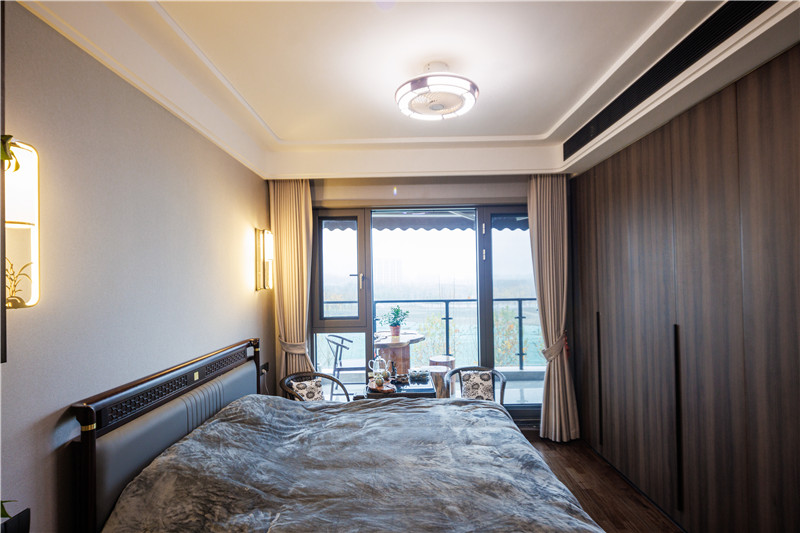 古典燈具+床頭板構(gòu)造彰顯雅韻;獨(dú)立陽臺+配套茶桌椅,悠閑生活輕松實現(xiàn);一字型頂天立地式衣柜,以合理分區(qū)滿足屋主的多重收納需求。