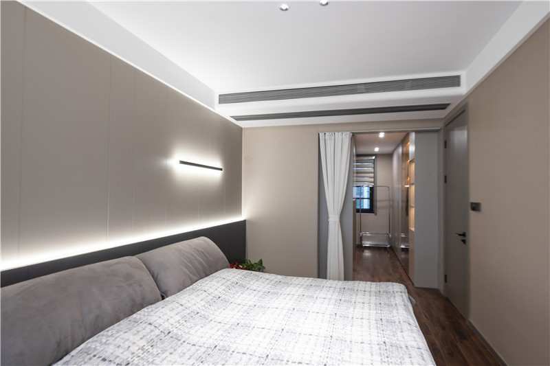 主臥床頭背景墻采用拼接設(shè)計,拼接處以燈光點綴,呼應(yīng)于藝術(shù)燈及局部燈光,滿滿氛圍感。