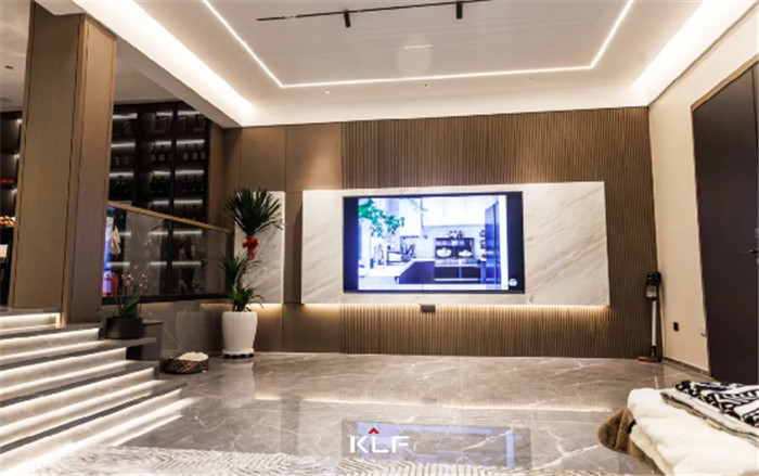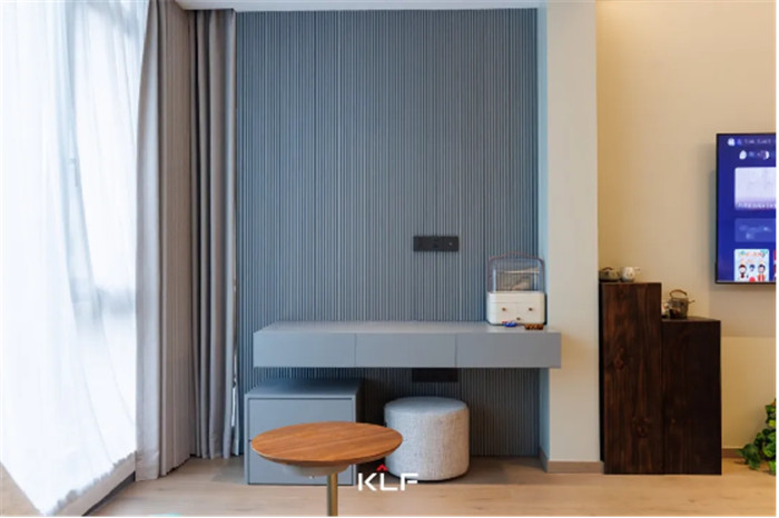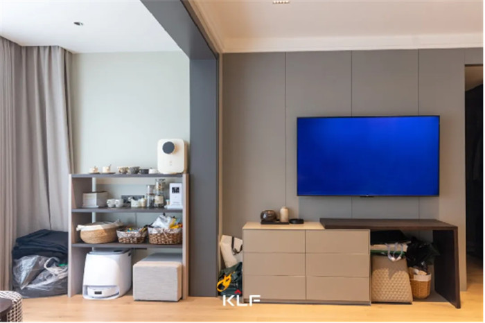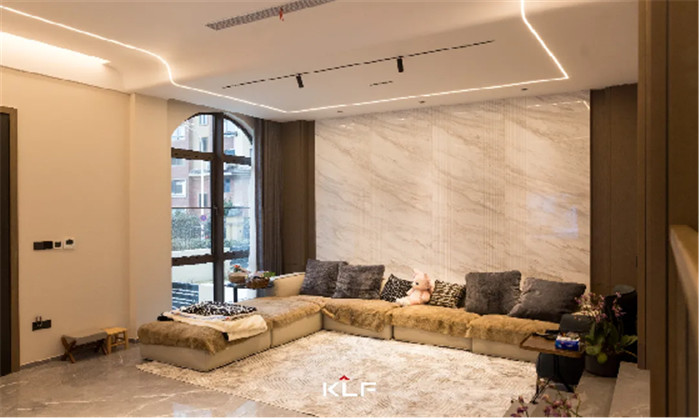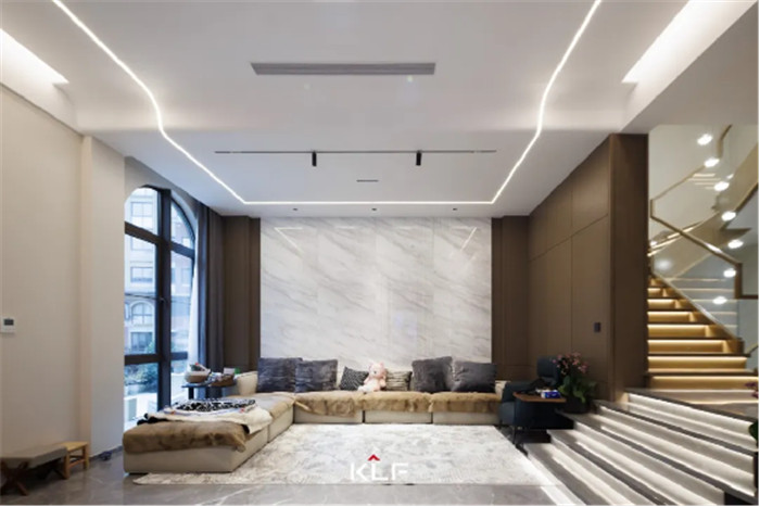 滿墻格柵設計增加舒適感,緩和輕奢風帶來的疏離,讓空間更加和諧宜居,客廳無主燈設計讓空間更加寬闊明亮。