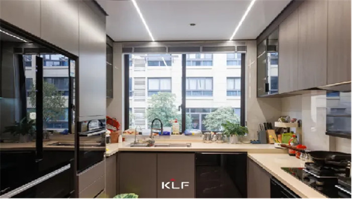 廚房主要以實用功能為主,將空間利用至理想化。U型布局擁有強大的收納儲物能力,將大型廚電內(nèi)嵌至櫥柜中,減輕客廳收納壓力,做飯也變得更加便利。