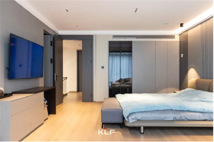 衣柜采用一柜到頂式設計,免去頂部打掃并增強收納能力。衣柜設計黑玻柜門增加輕奢感,并減緩大面積柜體帶來的沉悶。