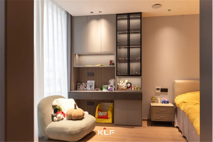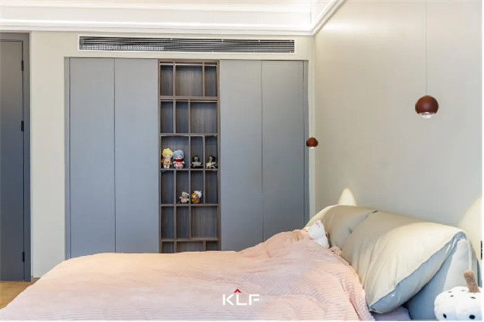 臥室設計中部不規(guī)則開放柜,放置日常玩偶、手辦、模型等收藏品,符合使用者所需,同時為衣柜增加了精致與顏值。