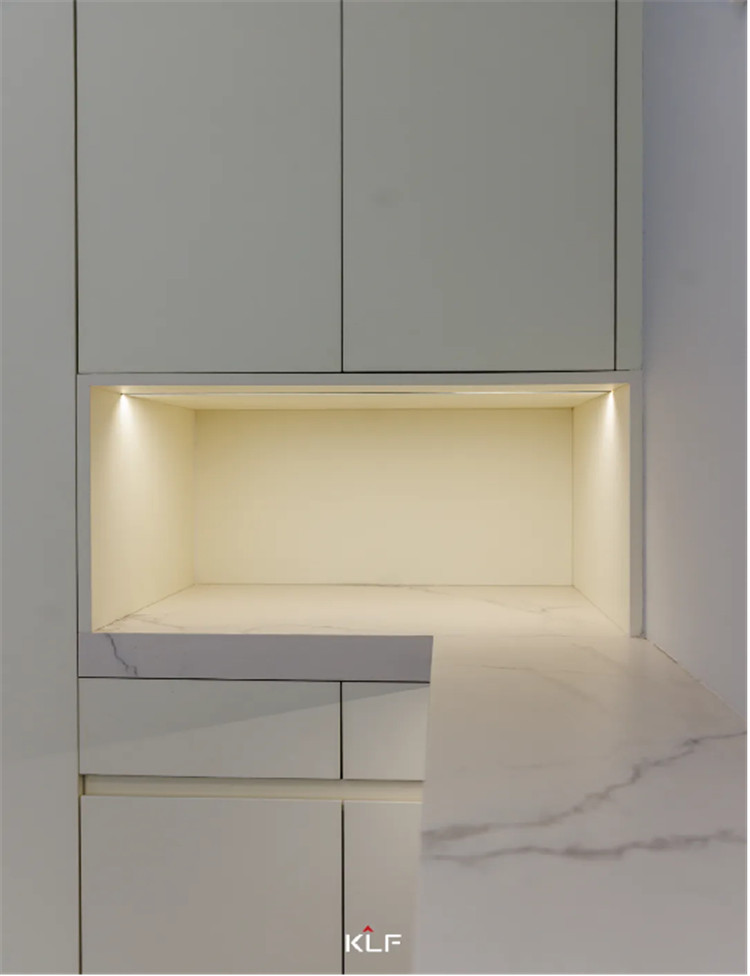在玄關(guān)為了提升空間利用率,我們采用了嵌入式的柜體進行上下分區(qū)收納。中部掏空后延伸大理石臺面作為置物臺,放置一些小物品都很實用。