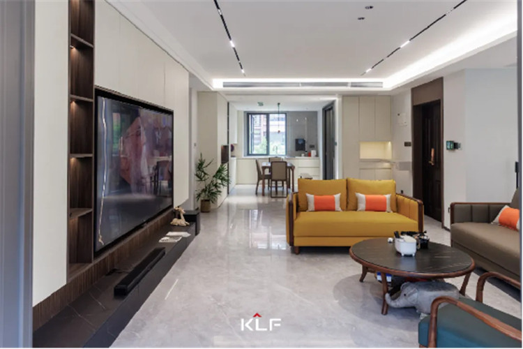 細格柵的造型墻板為墻面增加了立體感,一字型深灰色地柜直接落地,內(nèi)嵌3D霧化暖爐,帶給家更多溫馨。