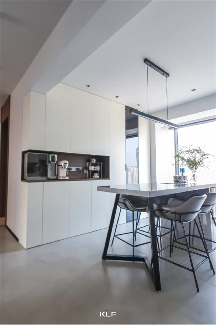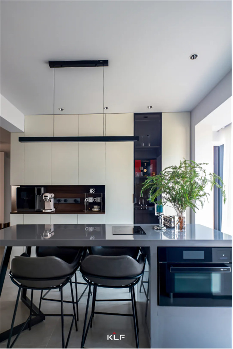 帶有中島操作臺的餐桌以深灰色呼應餐邊柜色彩,內嵌小型家用電器,有效節(jié)省廚房空間,幾何造型餐椅時尚感十足,與餐桌適配度很高。
