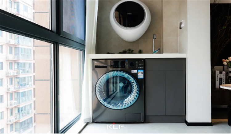 陽臺與客廳連通,沒有進行封閉式的處理,從而光線可以得到延伸,客廳空間更加通透溫暖。陽臺一側做洗衣區(qū),一側做懸空式酒柜,半透黑玻設計精致不張揚。