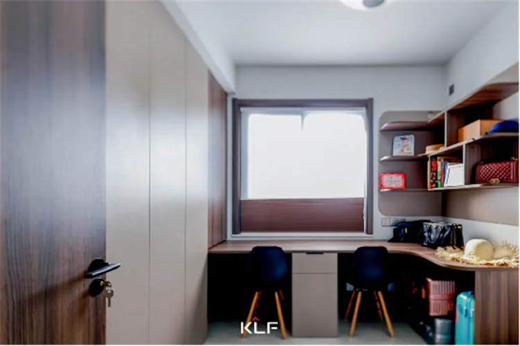 衣帽間采用嵌入式柜體設計,整排到頂衣柜保證了全家人的收納需求,靠窗而置的書桌可同時容納兩人的學習與辦公。