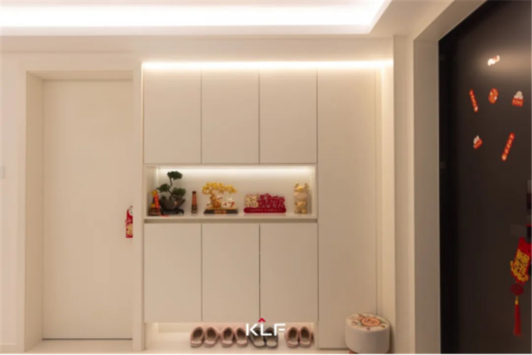 初見這個(gè)家,便有種一鏡到底的酣暢感,素雅色彩與洗練線條一路鋪陳,進(jìn)門便跌進(jìn)奶油色系的環(huán)抱中。入戶區(qū)域一側(cè)的奶油色到頂玄關(guān)柜美觀實(shí)用,鏤空設(shè)計(jì)方便進(jìn)出門換衣?lián)Q鞋和放置日常物品。褪下外部世界紛擾,療愈每一顆歸家的心。