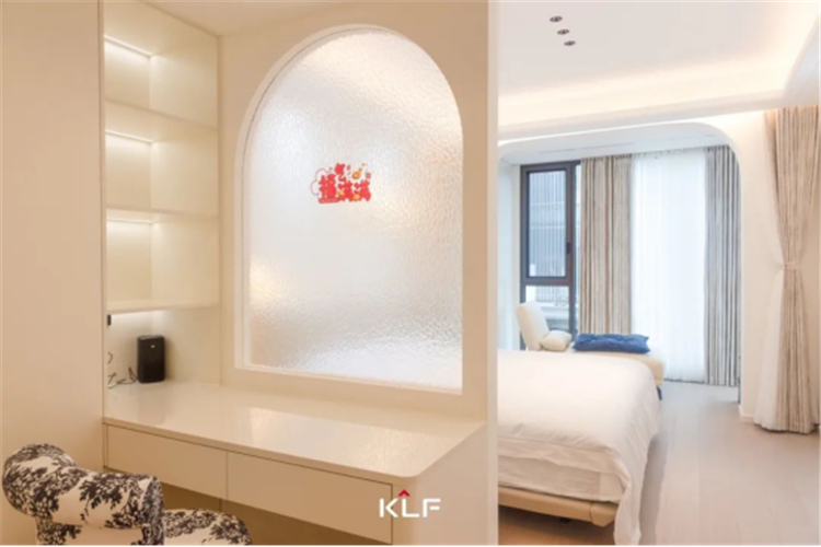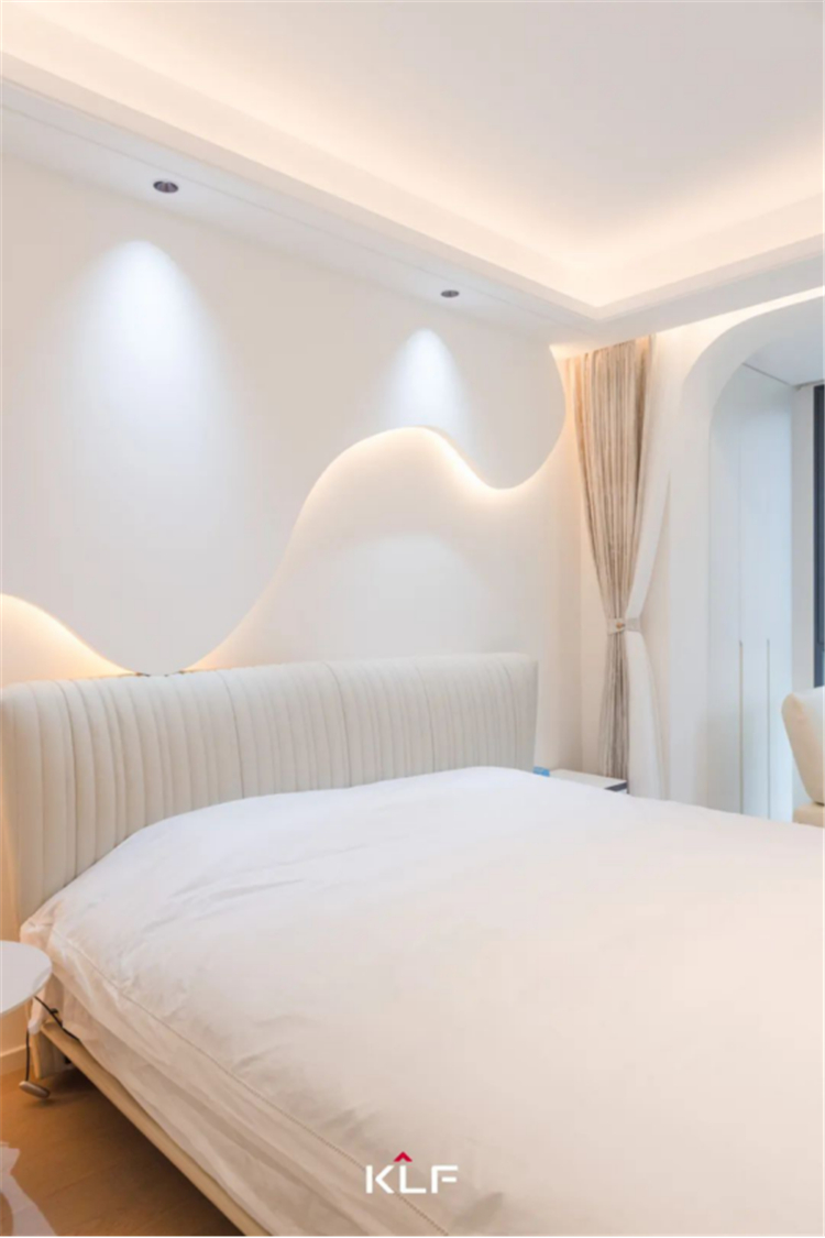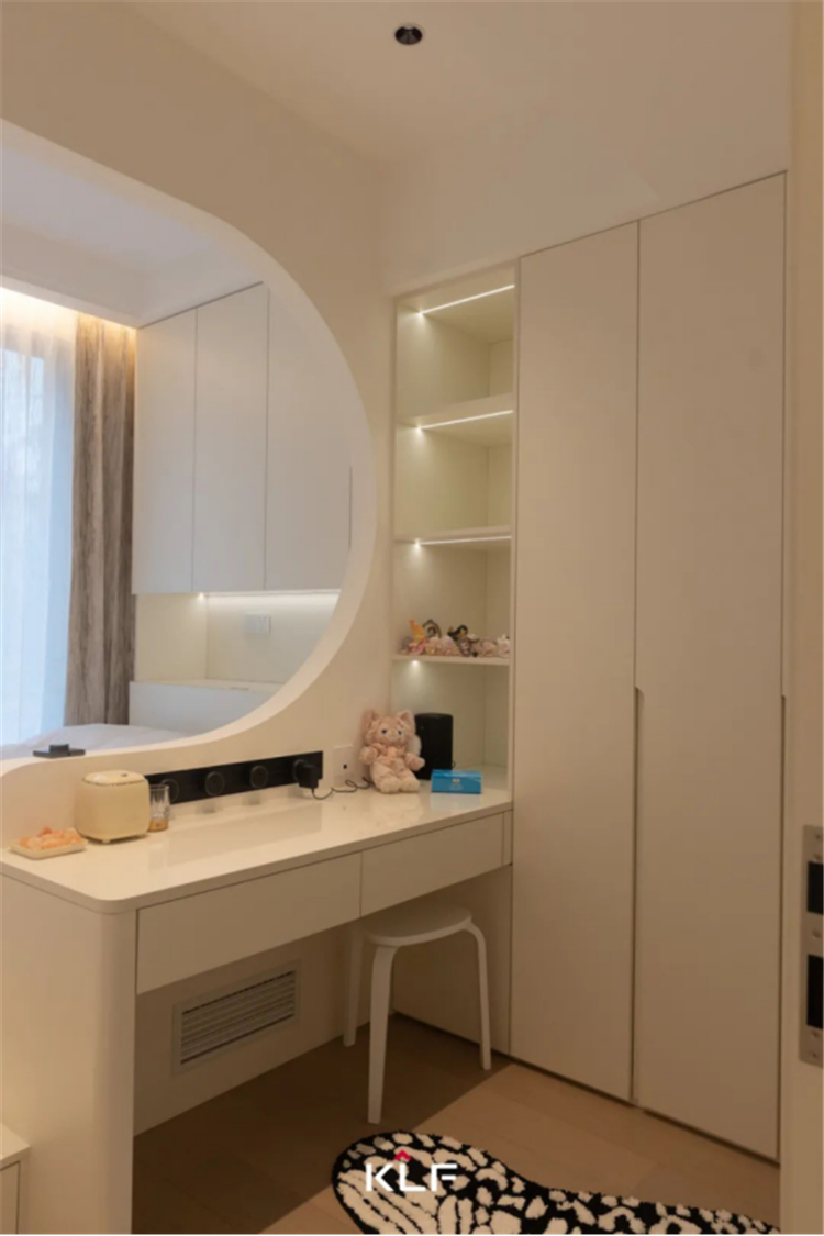 設(shè)計(jì)解鎖更加精簡的生活方式,打造流暢的洄游動(dòng)線。以柜為墻圍合出一隅衣帽間和梳妝臺(tái),與主臥構(gòu)成嵌套關(guān)系,提升空間利用率和居住便利性。床頭背景墻、門洞埡口、玻璃隔斷,多處采用圓弧線條勾勒輪廓,具體而微的細(xì)節(jié),消弭大面積純色的乏味和單調(diào),交匯成生活的豐富質(zhì)感,滿足居住者的審美期待。