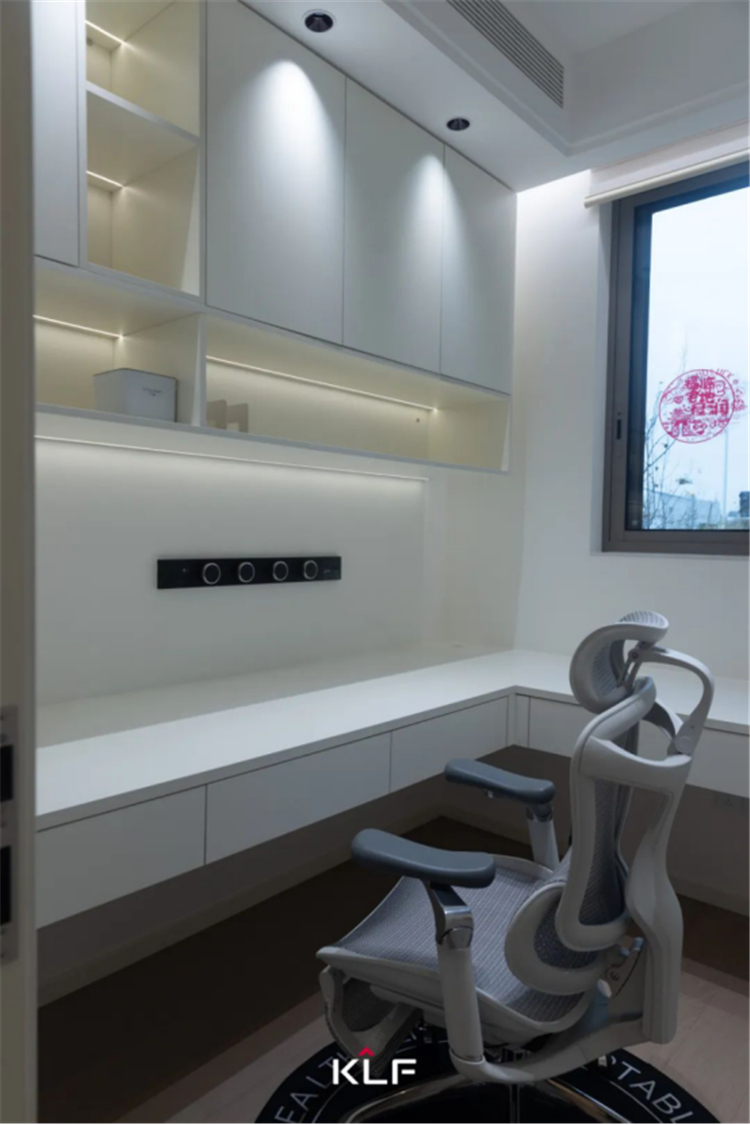 盈于咫尺,乾坤造境。書房是一個(gè)能讓人沉浸式思考與放松的理想天地。作為業(yè)主自己的精神空間站,書房靠墻定制吊柜和懸挑書桌,精簡有序、寬敞通透,強(qiáng)大的收納功能將瑣碎盡數(shù)歸置。