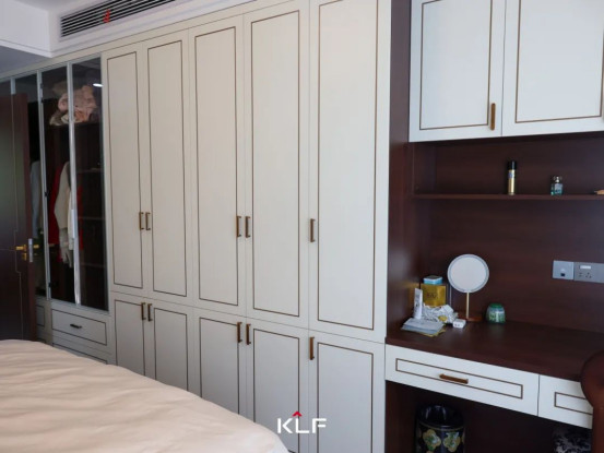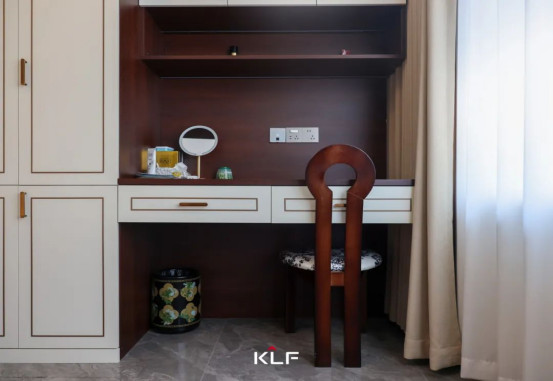 定制床尾柜,柜體盡頭采用進退手法劃分出懸浮梳妝區(qū),“上掛下抽”布局進一步豐滿視覺層次感。滿墻收納系統(tǒng)消隱于簡約柜門之后,呈現(xiàn)新中式主義“形式追隨功能”的終極解答,打造材質(zhì)碰撞的私屬領(lǐng)域,構(gòu)建居寢合一的復(fù)合場景。