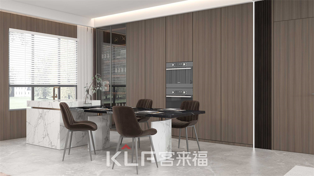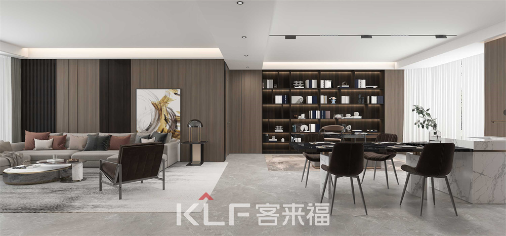 深咖色與木紋的巧妙結合,令客餐廳更顯沉穩(wěn)大氣。頂天立地柜的嵌入式與半開放式設計,空間立體感油然而生。三兩親朋相聚洽談,保證輕奢格調的同時滿足你的多樣化需求。