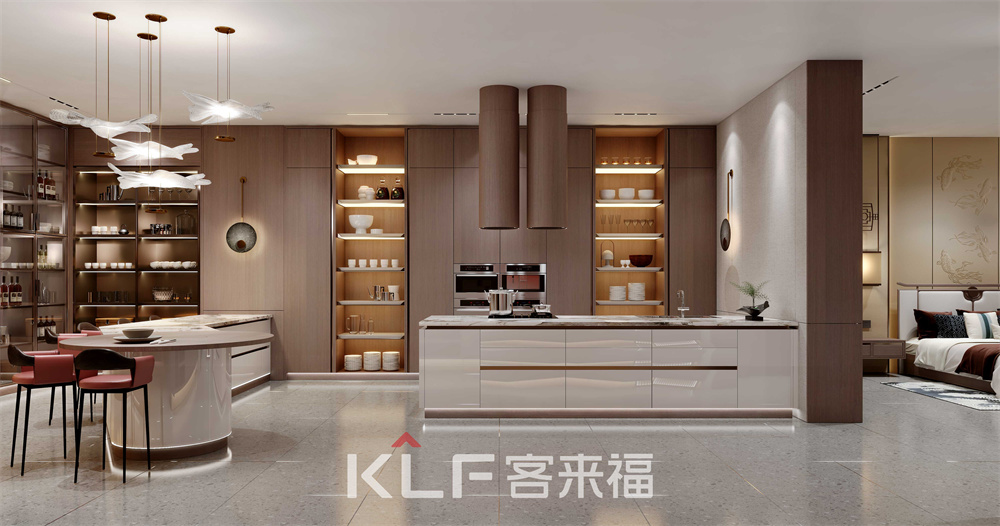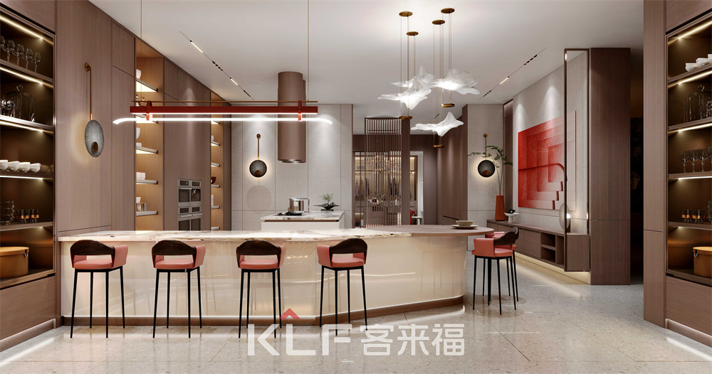 中式元素結合現(xiàn)代帶燈金屬柜和層板燈設計,讓人眼前一亮!藏露相宜的柜體設計,讓空間更具層次感;無拉手門板設計,符合現(xiàn)代人對生活的簡單追求;整體的中式裝修,展現(xiàn)出內(nèi)斂、質(zhì)樸的主人性格。客來福的新中式風格,兼具了實用與現(xiàn)代感。