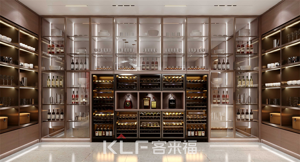 中式酒窖采用了對稱設計,左右開放柜,中間運用全透明超白玻型材玻璃門,讓酒窖的高端不可言語,彰顯出主人對酒品的熱愛,對生活的自由向往。