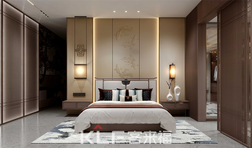 新中式臥室,整體高大整齊,外觀簡單無復雜線條。兩側對稱床頭柜,兼?zhèn)湫揎椗c臨時存放功能,搭配低飽和度燈光,營造適眠環(huán)境,保障家庭成員的睡眠質(zhì)量。