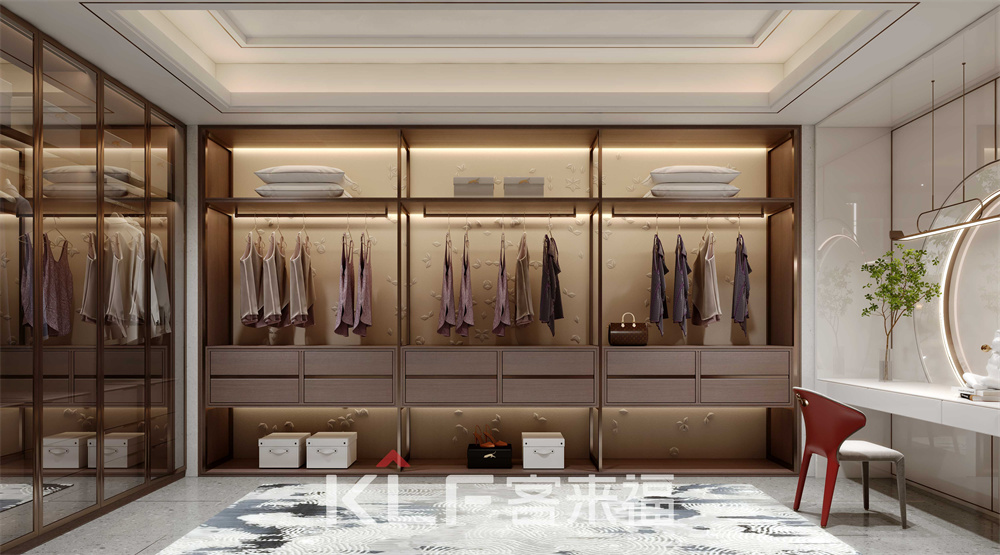 新中式開放式衣帽間,以屏風分隔其他空間,打造出一塊相對的獨立區(qū)域。背板運用皮雕工藝,鋁木型材框架搭配實木材質(zhì),布局主要存儲區(qū)。底部掏空,增強衣帽間的靈活性,中下部安裝推彈軌道抽屜,觸摸即可抽拉。