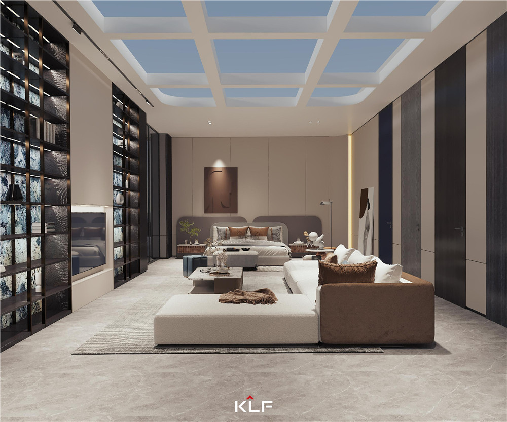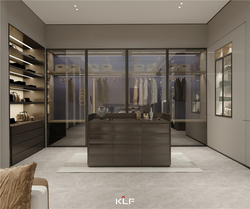 衣帽間采用時(shí)尚科技的電動(dòng)平移巴士門,于細(xì)節(jié)之處彰顯魅力;將衣柜分為疊放區(qū)、懸掛區(qū)和抽拉區(qū),分功能存儲(chǔ)提高生活便捷度;衣帽間島臺(tái)中間可設(shè)計(jì)升降飾物架,存儲(chǔ)高價(jià)值的飾品。